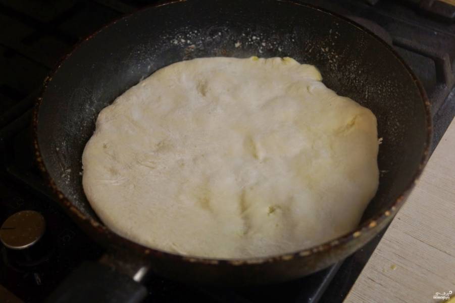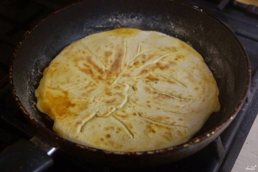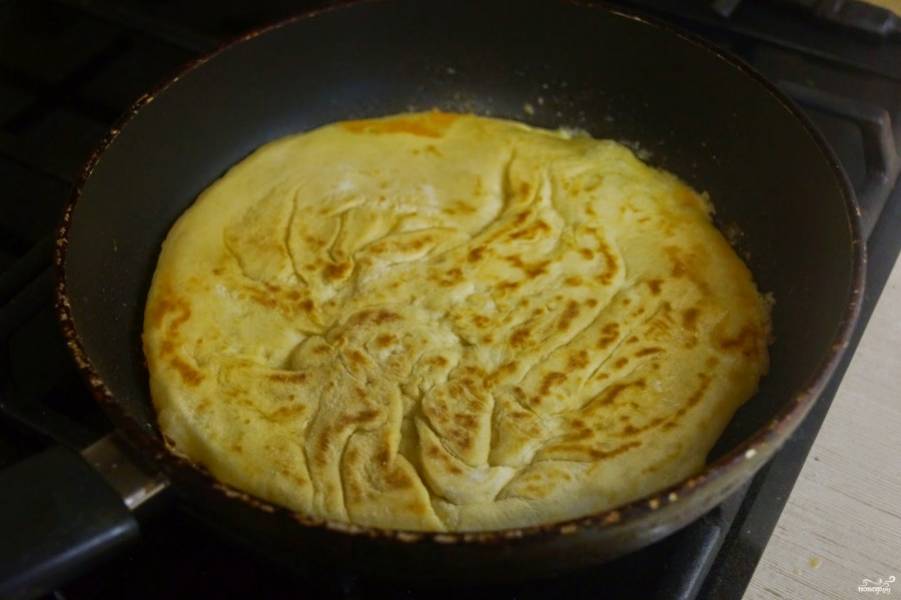 Сковородку разогрейте и смажьте слегка сливочным маслом. Жарить хачапури надо с двух сторон до золотистого цвета по 4-5 минут с каждой стороны.
