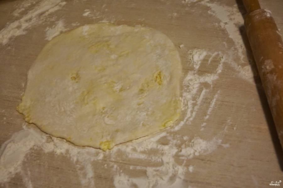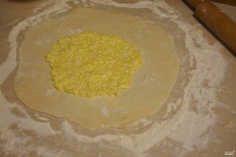 Тесто достаньте из холодильника и разделите на 5 частей. Раскатайте их в лепешки. В центр каждой лепешки выложите начинку, оставив прилично по краям.
