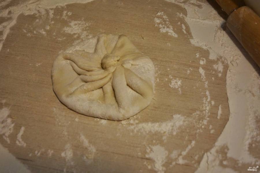 Соберите тесто в центр (как будто торбу собираете), скрепите края как следует. Затем переверните швом вниз.