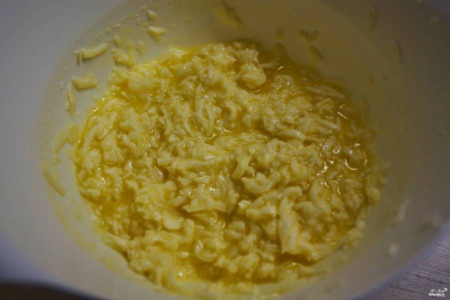Отправьте тесто пока в холодильник. А сами можете заняться начинкой. Для этого сыр натрите на терке средней. Масло растопите и добавьте к сыру.