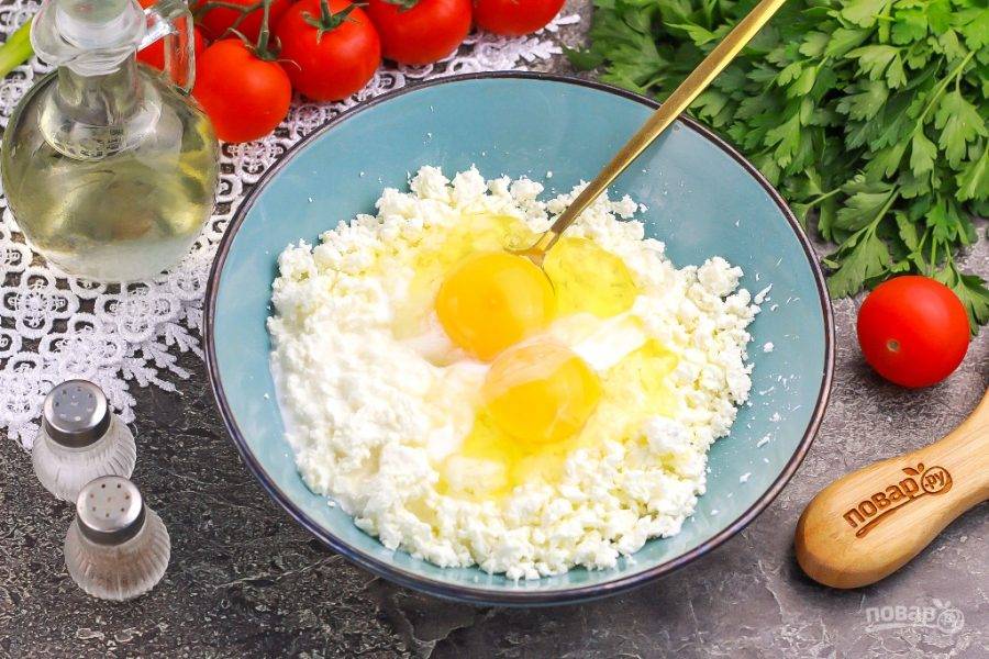 Творог любой жирности выложите в глубокую емкость и разотрите вилкой, разбейте крупные кусочки, если такие есть.