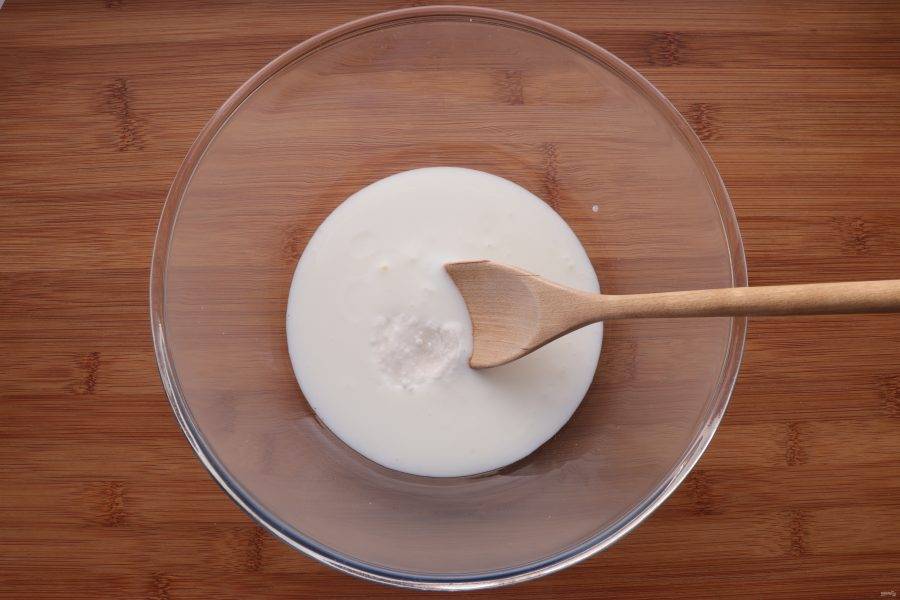 Кефир налейте в миску, добавьте в него соду и размешайте.