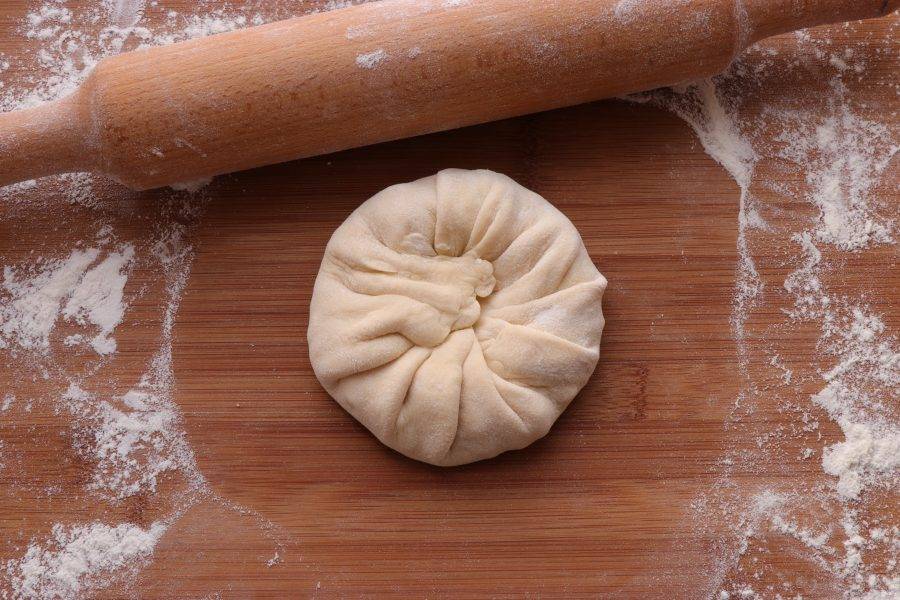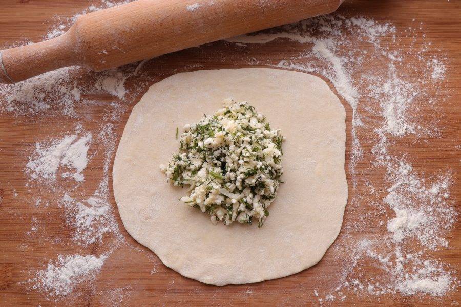 Тесто разделите на 8 равных частей. Каждую часть тонко раскатайте. На середину положите начинку.