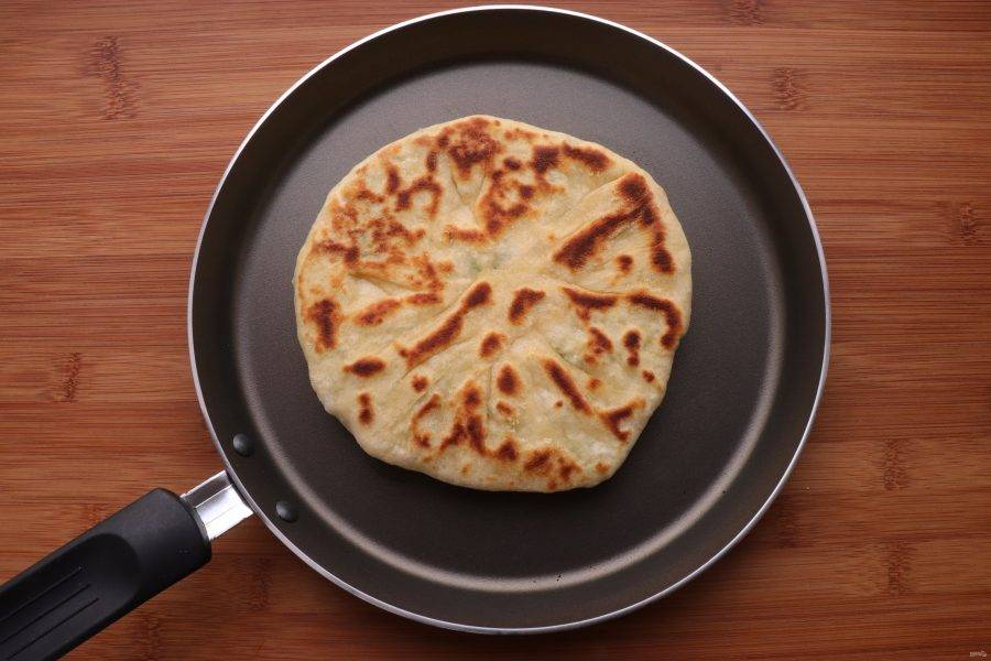 Обжарьте хачапури на сухой сковороде, не забывая смазывать тесто, до румяной корочки.