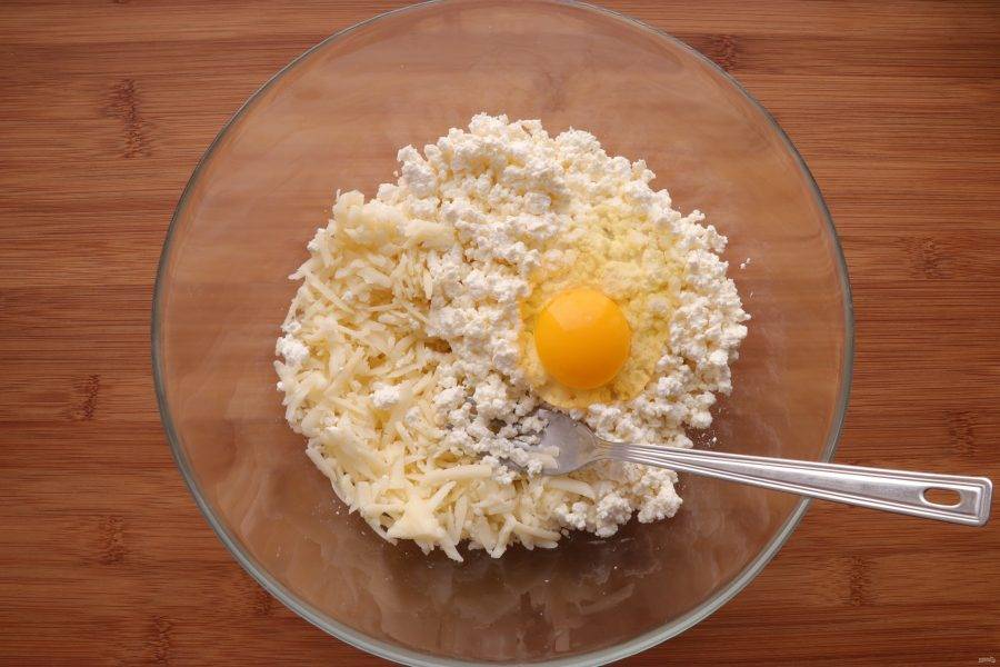 Для того чтобы приготовить начинку, натрите сыр на крупной терке, добавьте к нему творог и одно яйцо, перемешайте.