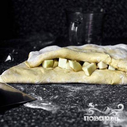 2. Яблоки очистить, разрезать пополам, удалить сердцевину и нарезать ломтиками. Сбрызнуть яблоки лимонным соком, чтобы они не потемнели. Выложить тесто на посыпанную мукой и придать продолговатую форму. Выложить на половину теста 2/3 яблок.