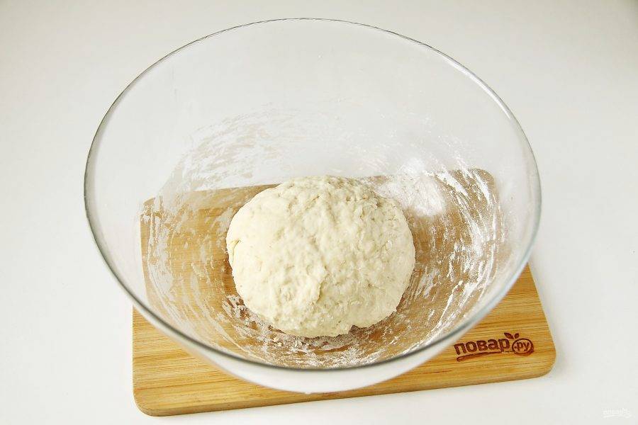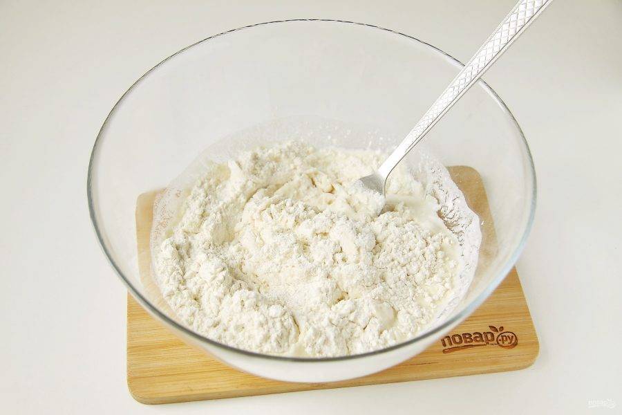 Перемешайте все ложкой, затем руками замесите мягкое, чуть липкое тесто. Соберите тесто в шар, заверните в пленку и уберите в холодильник на 30-40 минут.