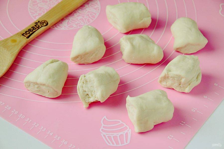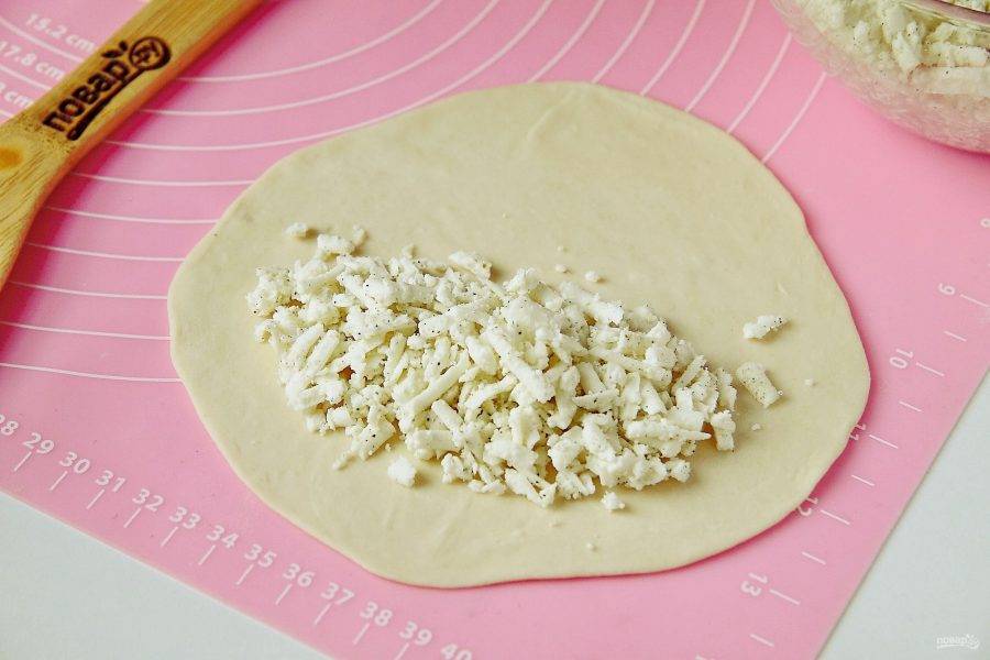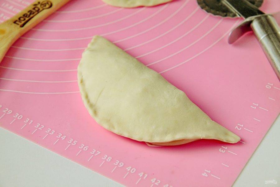 Каждый кусочек теста раскатайте в форме круга, толщиной около 2-3 мл. На один край теста положите начинку.