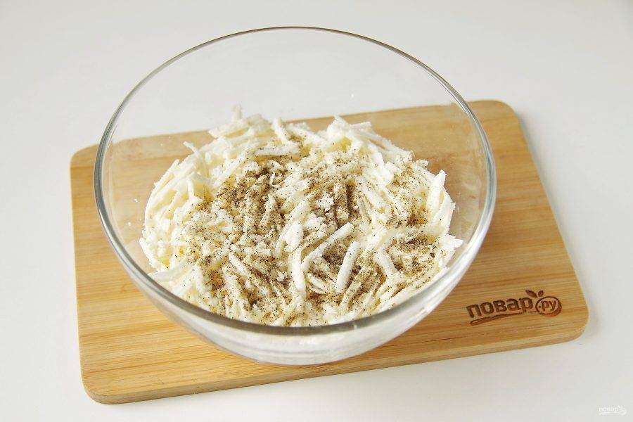 Для начинки сыр натрите на терке или просто раскрошите руками. Добавьте к нему, если необходимо, соль и черный молотый перец по вкусу.