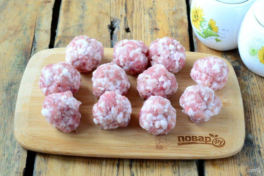 Фарш посолите и поперчите по вкусу, сформируйте из него небольшие шарики, выложите их на разделочную доску, накройте пищевой пленкой и отправьте в холодильник на 30 минут.