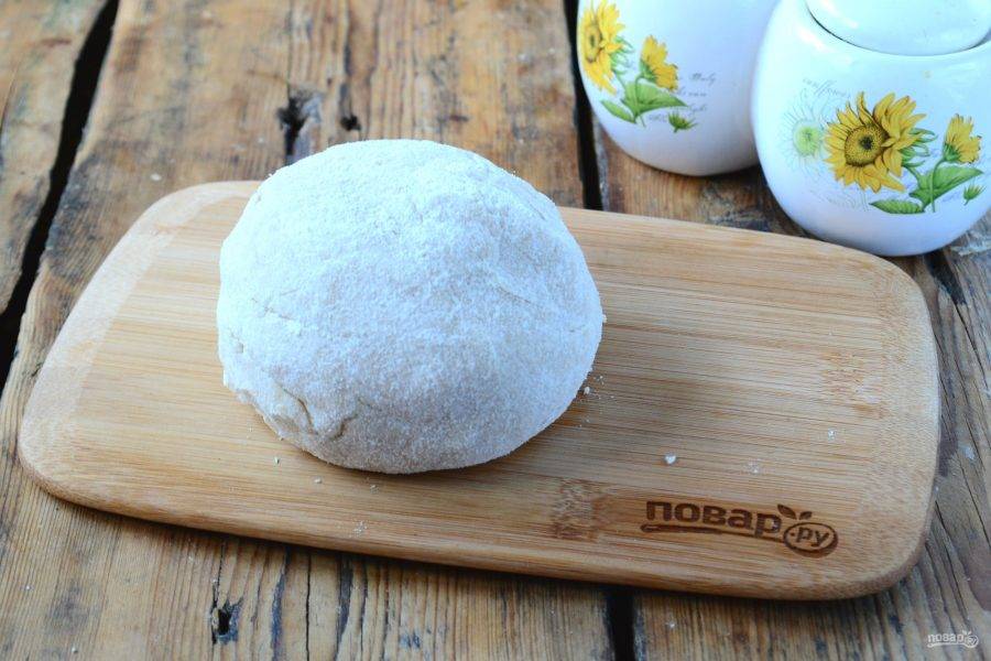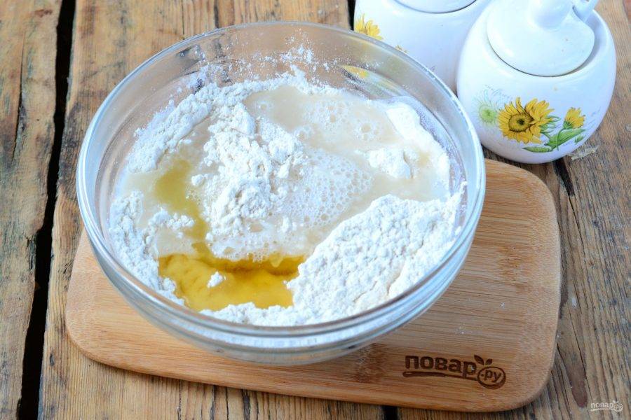 Приготовьте заварное тесто. Муку смешайте с солью, добавьте к ней 1,5 ст. ложки растительного масла, влейте кипяток и энергично перемешайте.