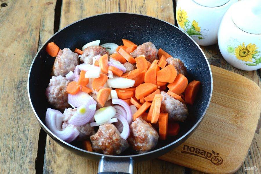 Лук порежьте полукольцами, морковь порежьте крупной соломкой. Отправьте овощи в сковороду к фрикаделькам и жарьте еще минут 7-10.