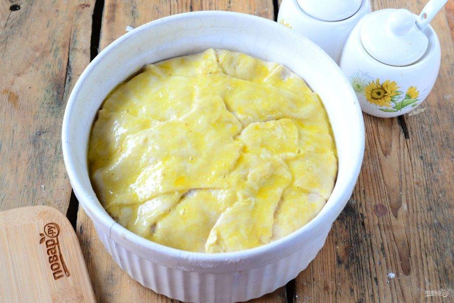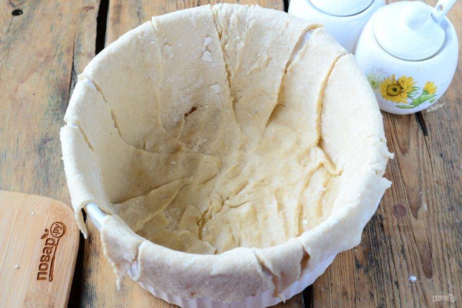 Тесто раскатайте тонко в форме круга, разрежьте его на 8-10 секторов. Форму для запекания или казанок обильно смажьте растительным маслом, выложите сегменты теста, чтобы покрылось дно и стены, а кончики чтобы свисали через бортик.