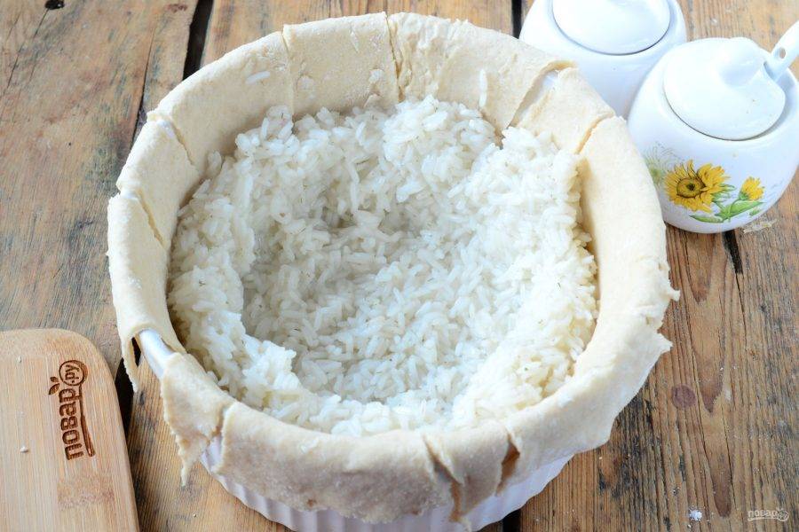 Накройте рис кончиками теста, смажьте взбитым яйцом и отправьте в духовку на 20-30 минут (температура — 180 градусов).