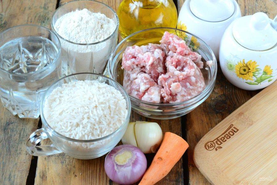 Подготовьте все необходимые ингредиенты. Рис отварите в подсоленной воде с добавлением шафрана почти до готовности, не доварите его всего несколько минут.