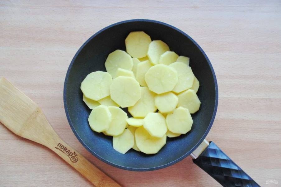 Выложите картофель в сковороду. Налейте 50 мл. воды. Накройте крышкой и тушите до полуготовности.