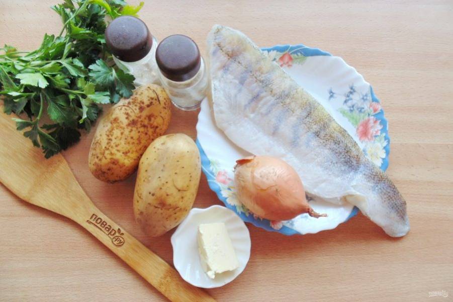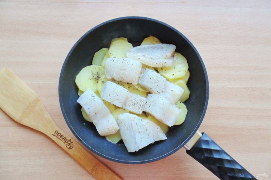 На картофель выложите филе рыбы. У меня это судак. Посолите и поперчите по вкусу.