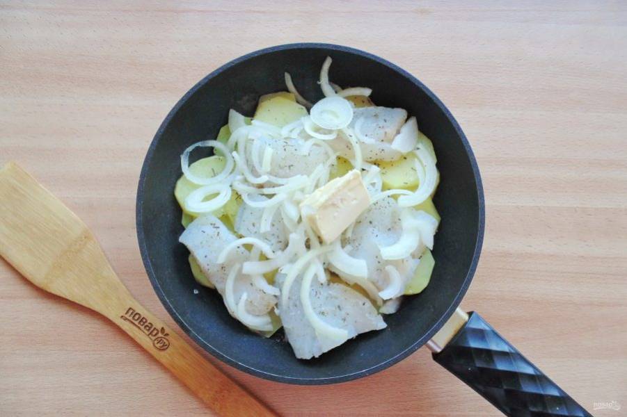 Накройте сковороду крышкой и тушите рыбу с картофелем и луком еще 10-12 минут до готовности. После посыпьте нарезанной петрушкой или укропом.