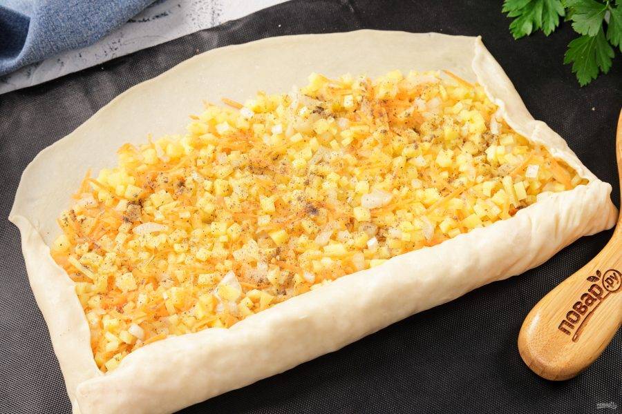 Разделите начинку на три равные части. Выложите одну порцию начинки на сочень, разровняйте её по всей поверхности, оставив свободными края. Посолите и поперчите начинку по вкусу. Можете добавить любые специи по вкусу.