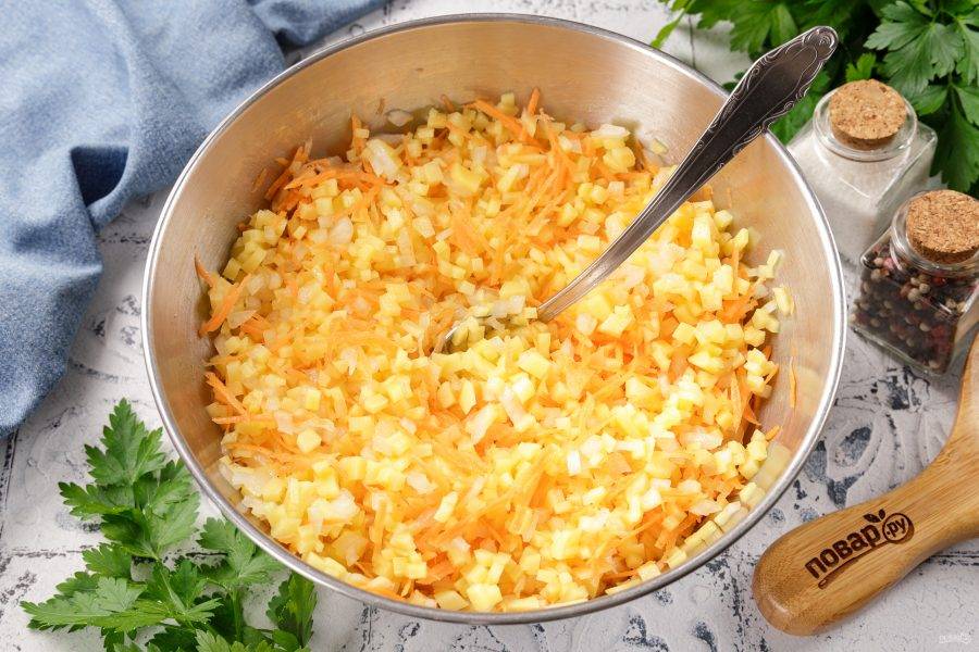 Для начинки лук и картофель нарежьте мелкими кубиками, чем мельче получится, тем лучше. Морковь натрите на мелкой тёрке.