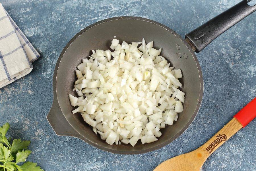В сковороде разогрейте масло и выложите лук, нарезанный кубиками.