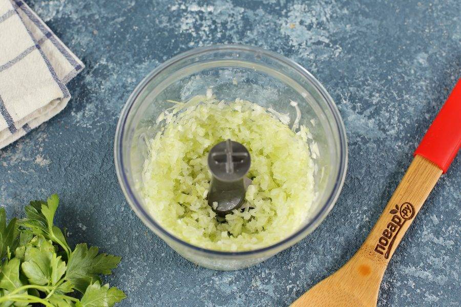 Сельдерей нарежьте кусочками и измельчите в блендере. Можно просто мелко нарезать ножом.