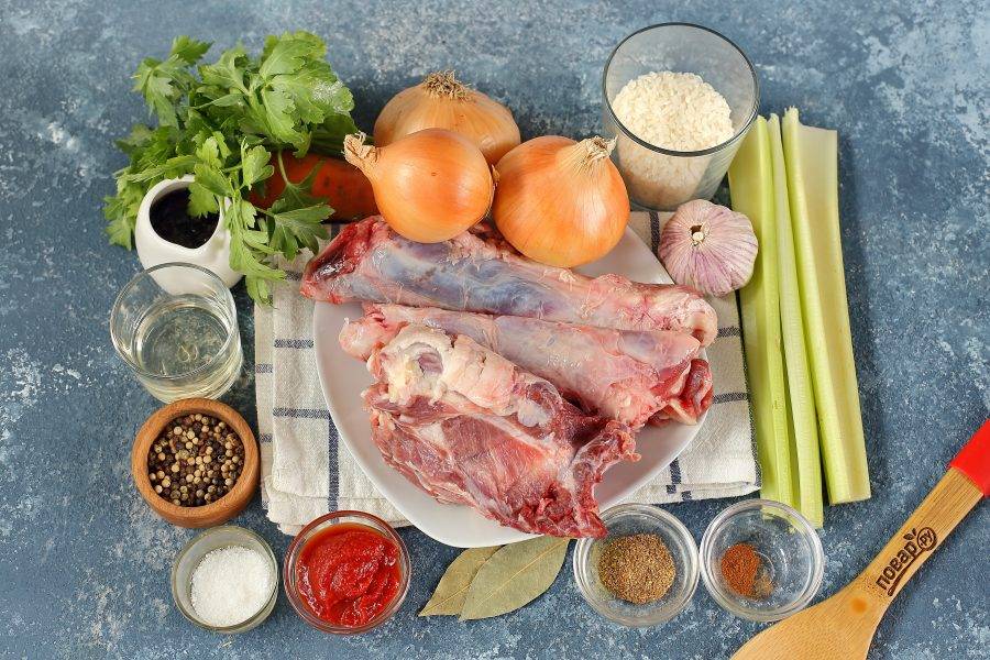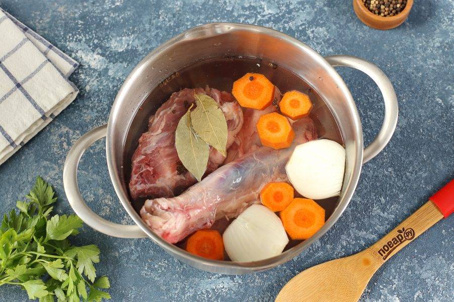 В кастрюлю выложите промытое мясо. Добавьте лавровый лист, перец горошком, соль по вкусу, одну нарезанную морковь и луковицу. Варите до полной готовности мяса. Готовый бульон необходимо затем процедить, а мясо отделить от костей и нарезать кусочками.