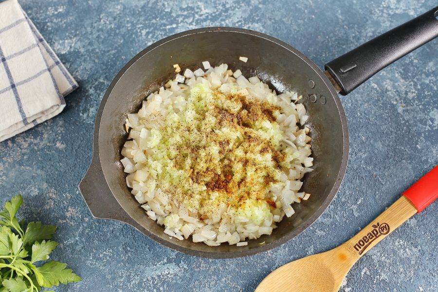 Обжарьте лук до мягкости, добавьте сельдерей и специи по вкусу. Готовьте помешивая 3-5 минут.