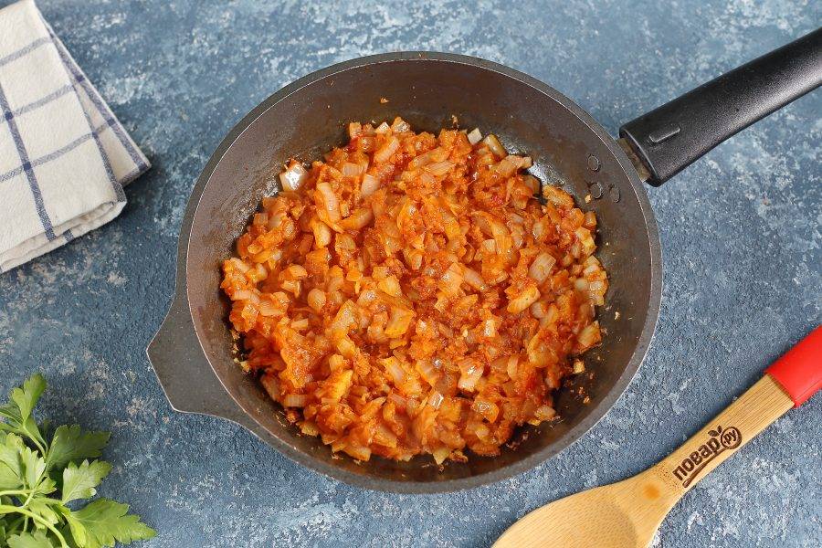Затем добавьте томатную пасту и готовьте еще пару минут.