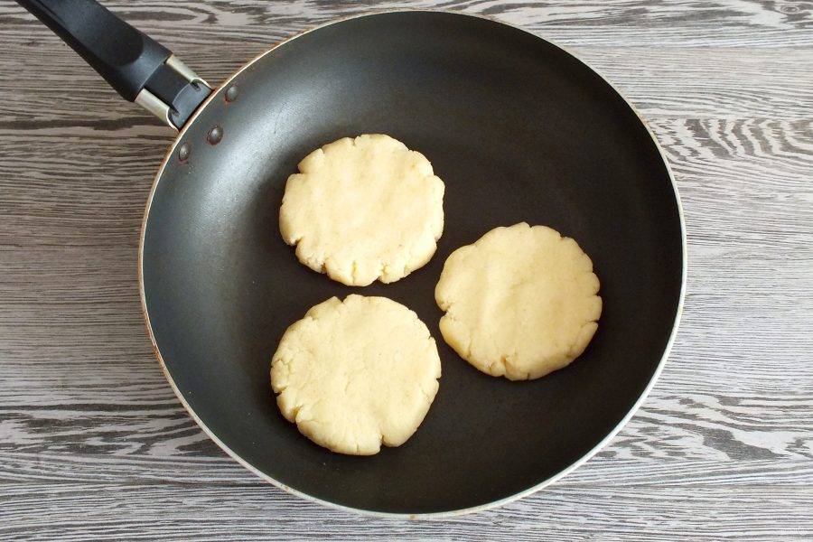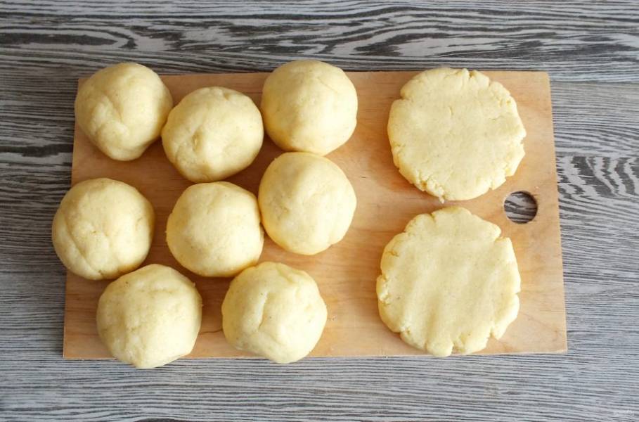 Каждый шарик прижмите ладонью или лопаткой до толщины не более 0,5 см.