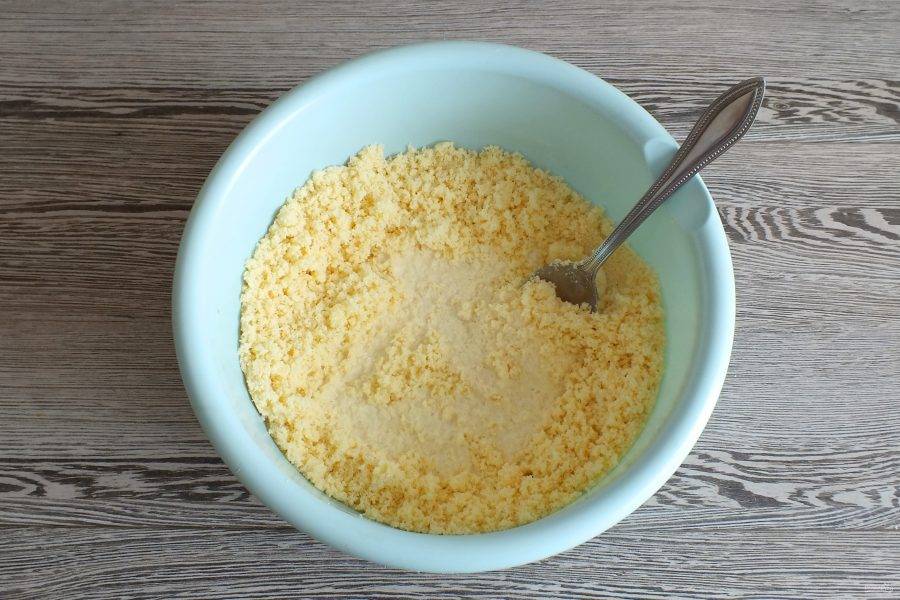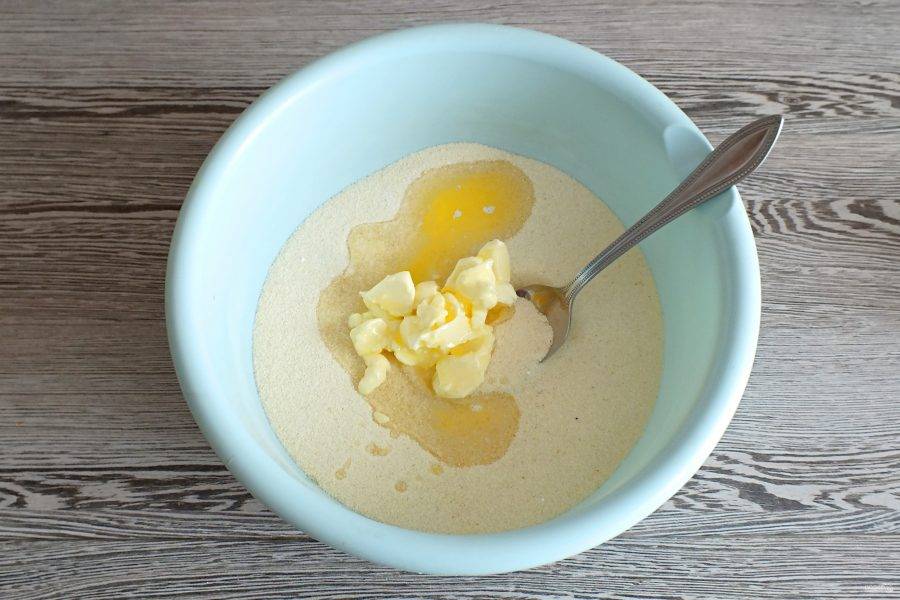 Добавьте подтаявшее не до конца сливочное масло. Разотрите руками или ложкой. Важно, чтобы крупа полностью была смешана с маслом.