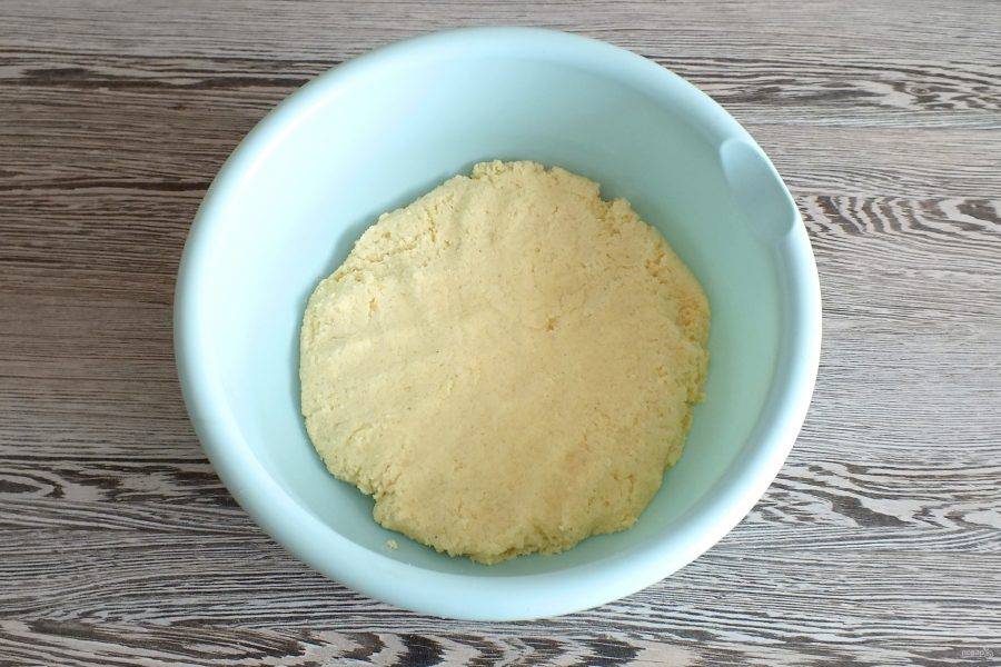 Замесите тесто. Оно должно хорошо держать форму. Поэтому, если жидкое добавьте немного манки. Допускается до трех столовых ложек. Оставьте тесто в чаше на 10 минут.