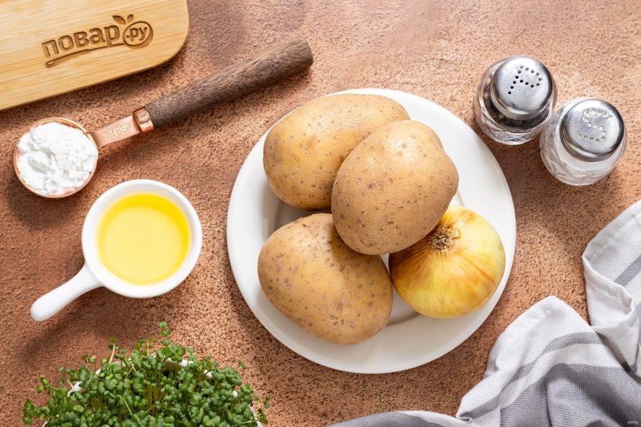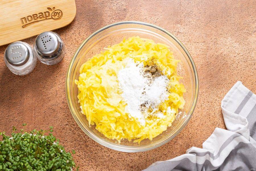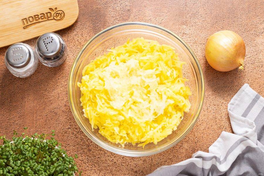 Репчатый лук натрите на мелкой терке и отожмите от лишнего сока. Добавьте репчатый лук к картофелю.