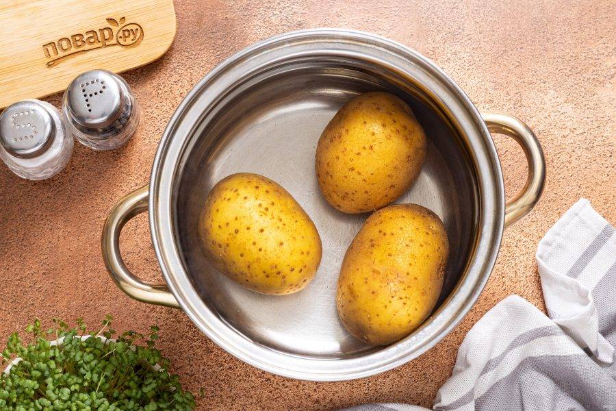 Картофель тщательно помойте. Отварите в кипящей воде до полуготовности. Он должен стать совсем немного мягким снаружи.