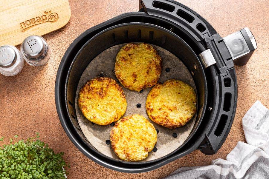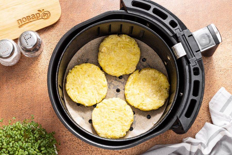 Смажьте дно решетки аэрогриля растительным маслом. Выложите хашбрауны и немного смажьте их сверху для румяной корочки. Готовьте около 10 минут при температуре 185 градусов.