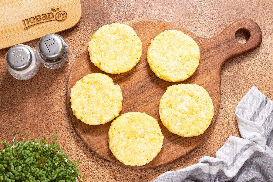 Сформируйте хэшбрауны. Удобнее это делать чуть влажными руками. Можно сделать их круглыми, а можно более традиционными овальными или треугольными.