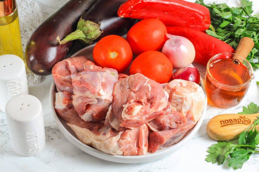 Подготовьте указанные ингредиенты. Баранину промойте, нарежьте порционными кусками и срежьте жилы, пленки.