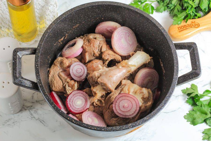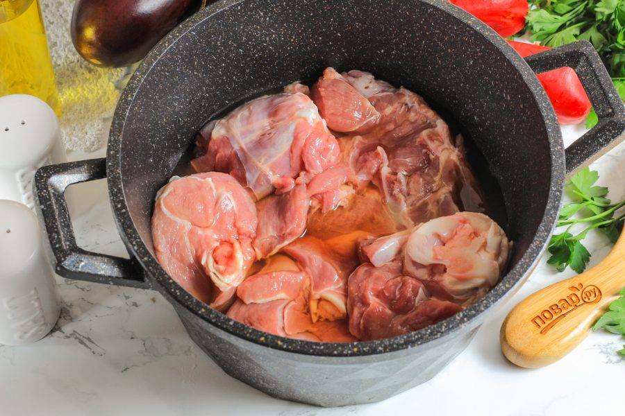 Выложите ее в казан ровным слоем. Солить и перчить на этом этапе мясо не нужно.