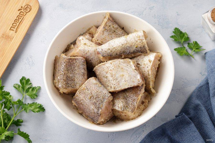 Срежьте плавники и нарежьте рыбу на стейки желаемой вам толщины. Переложите в глубокую миску.
