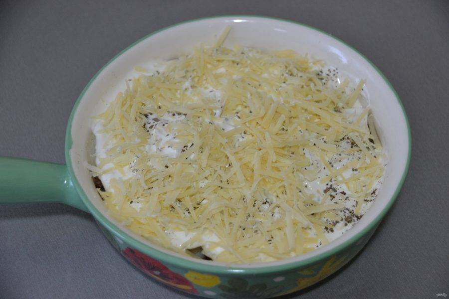 Добавьте сметану, посыпьте ароматными травами, посыпьте тертым сыром.