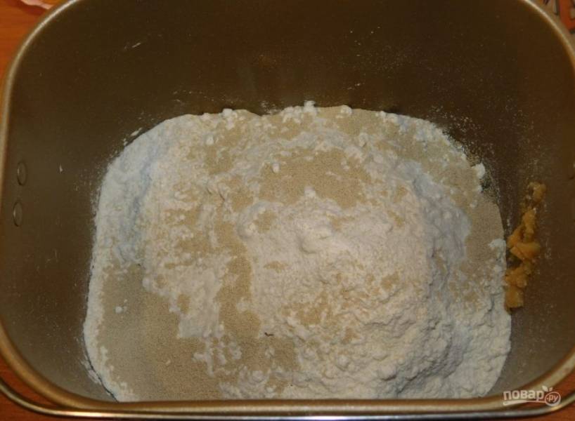Насыпьте необходимое количество муки, влейте растительное масло, воду и добавьте дрожжи. Включите основной режим выпекания хлеба, у меня он длится 2 часа и 50 минут.