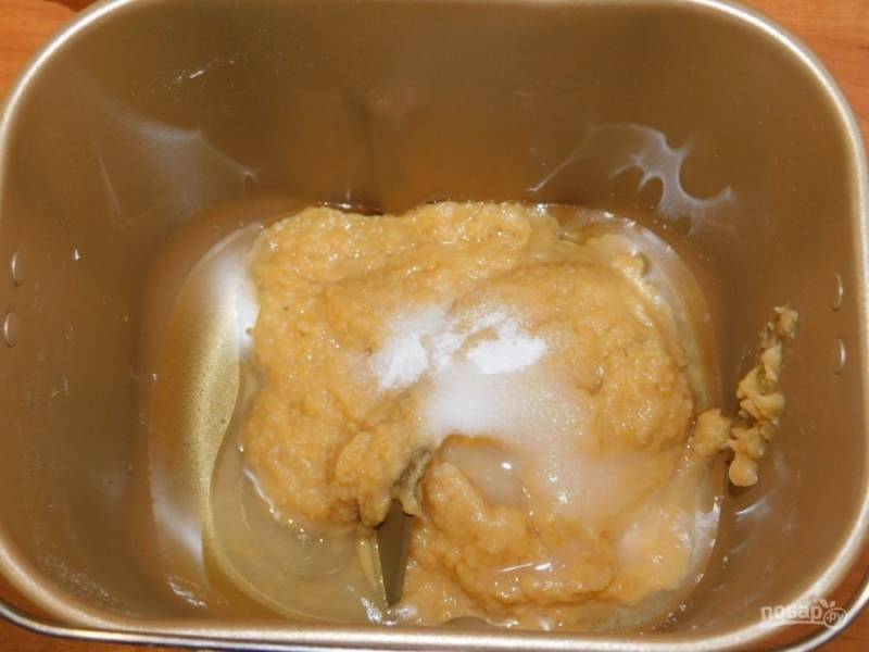 Выложите чечевицу в хлебопечку, должно быть 300 г, если не хватает - подлейте воды. Добавьте соль и сахар.