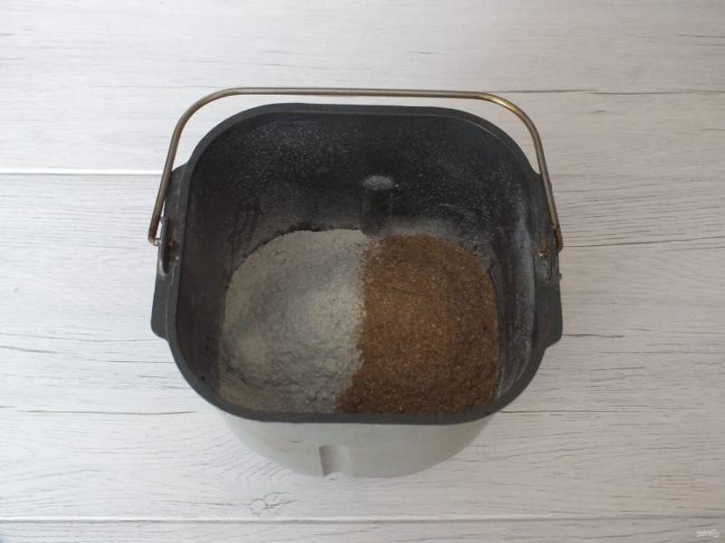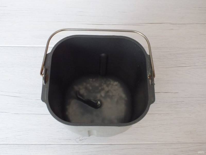 В ведерко хлебопечки налейте теплую воду, раскрошите дрожжи. Добавьте соль, фруктозу.