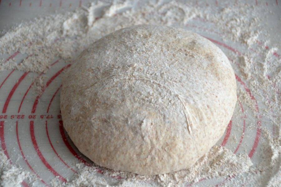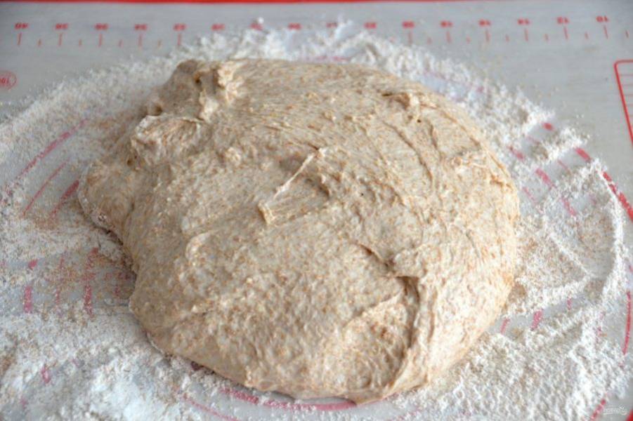 Присыпьте рабочую поверхность стола смесью муки и отрубей, выложите тесто.