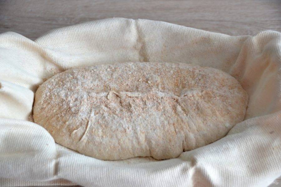 Через 30 минут сформуйте хлеб любой формы, выложите "швом вверх" на расстойку в корзинку или миску, застеленную тканью, в которую вбейте муку с отрубями, чтобы хлеб при расстойке не прилип. Расстойка 1-1,5 часа.