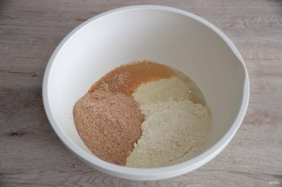 Для замеса теста возьмите 100 мл. воды от общего количества, выложите в нее всю опару, всыпьте сахар, просеянную муку, добавьте отруби. Смешайте, оставьте при комнатной температуре на 30-40 минут. Если не уверены в своей закваске, на этом этапе можно добавить 3-5 грамм дрожжей.