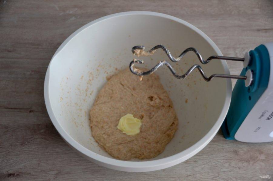 На последнем этапе замеса теста добавьте сливочное масло и вымесите тесто с маслом, можно месить руками, можно с помощью миксера.