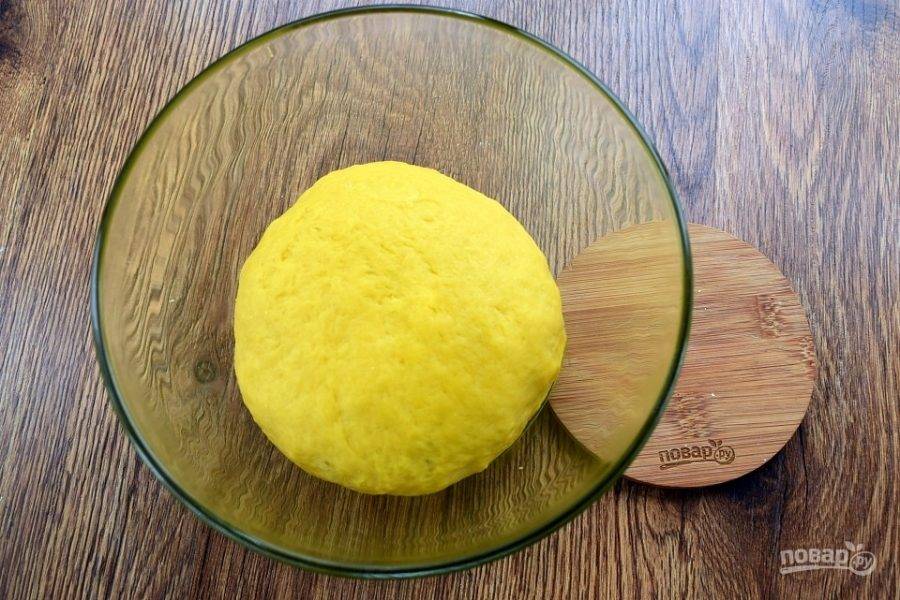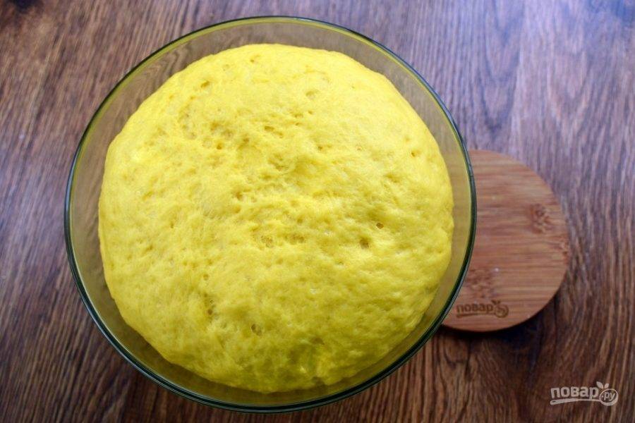 Влейте в муку подошедшие дрожжи, растопленное масло, яйца. Замесите мягкое тесто. Тесто стоит вымешивать не менее 10 минут. Поместите тесто в миску, слегка смазанную маслом, накройте и поставьте в теплое место для подхода на 1 час.