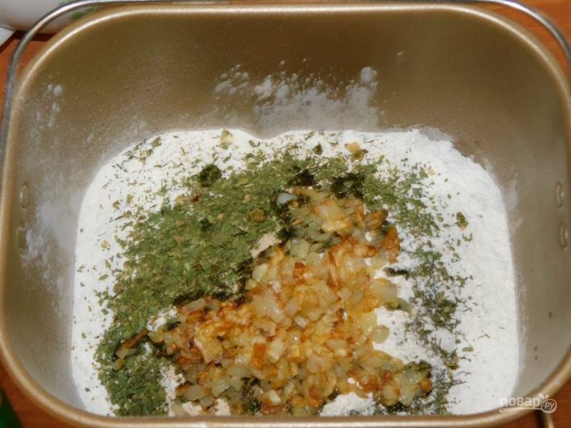 Добавьте сухие травы и лук. Включите основной режим выпечки, у меня он длится 2 часа 50 минут.