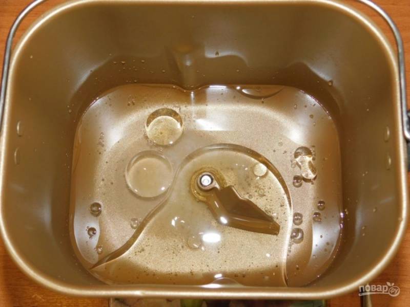 Затем в чашу хлебопечки налейте воду, добавьте соль, сахар и растительное масло.